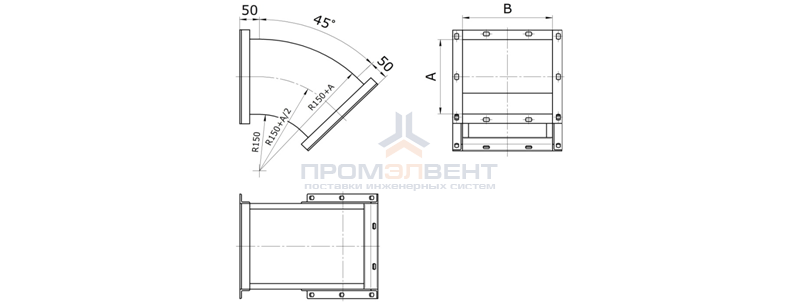 Отводы 45 градусов прямоугольного сечения предназначены для плавного направления системы дымоудаления под углом 45 градусов по горизонтали или вертикали.